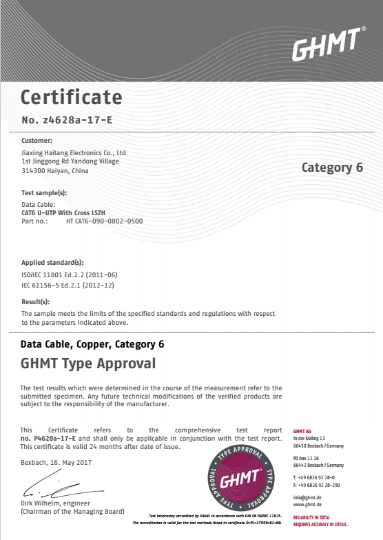 ELECTRICAL PERFORMANCE 1.ETL S/FTP CAT7 23AWG LSZH U/FTP CAT6A 23AWG LSZH UTP CAT6 24AWG PVC U/UTP CAT6 LSZH U/UTP CAT5E PVC U/UTP CAT5E LSZH F/UTP CAT5E LSZH F/UTP CAT6 LSZH 2.GHMT DE/CAT6 U/UTP WITHOUT CROSS LSZH EN/CAT6 U/UTP WITHOUT CROSS LSZH DE/CAT6 U/UTP WITH CROSS LSZH EN/CAT6 U/UTP WITH CROSS LSZH DE/CAT6A U/FTP LSZH EN/CAT6A U/FTP LSZH DE/CAT7A S/FTP LSZH CAT8 3.SGS CAT6A U/UTP PVC / CAT6A U/UTP PVC NR / CAT6A U/UTP LSZH NR / CAT6A F/UTP PVC / CAT6A F/UTP LSZH CAT6A U/UTP(UNCONTINUAL AL-FOIL)